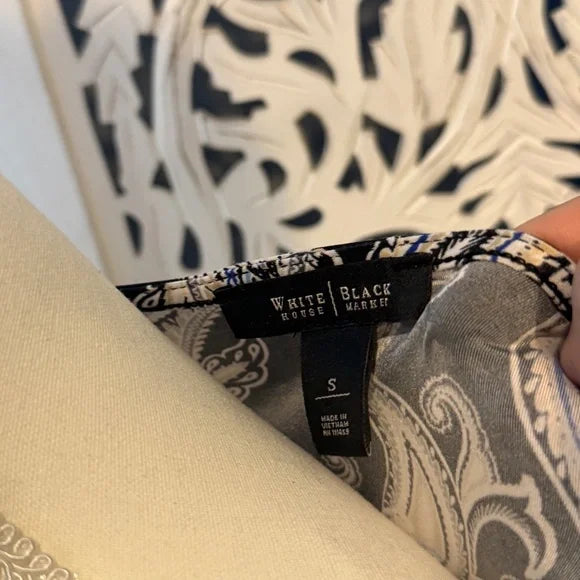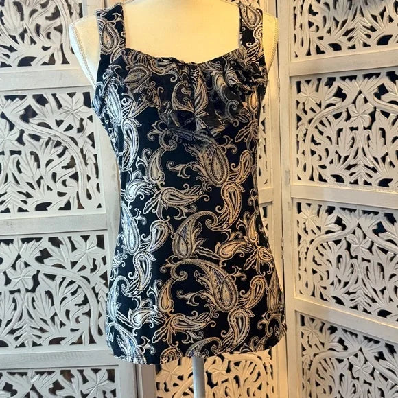 This sophisticated tank top from White House Black Market features a fitted and ruched design in elegant black and gray hues. The sleeveless style and classic scoop neckline make it a versatile piece, perfect for dressing up or down. The ornate paisley pattern adds a touch of elegance to any outfit.